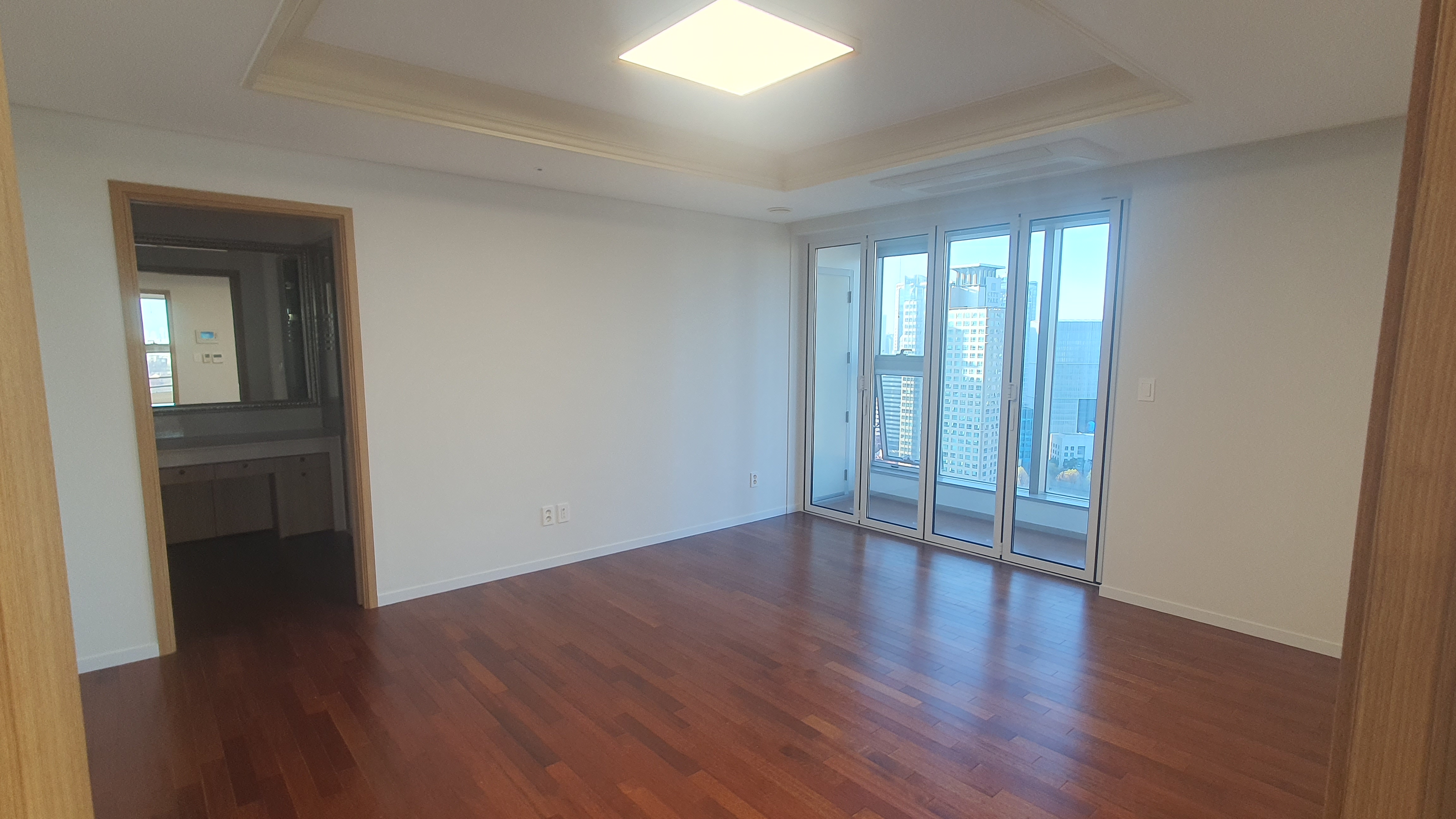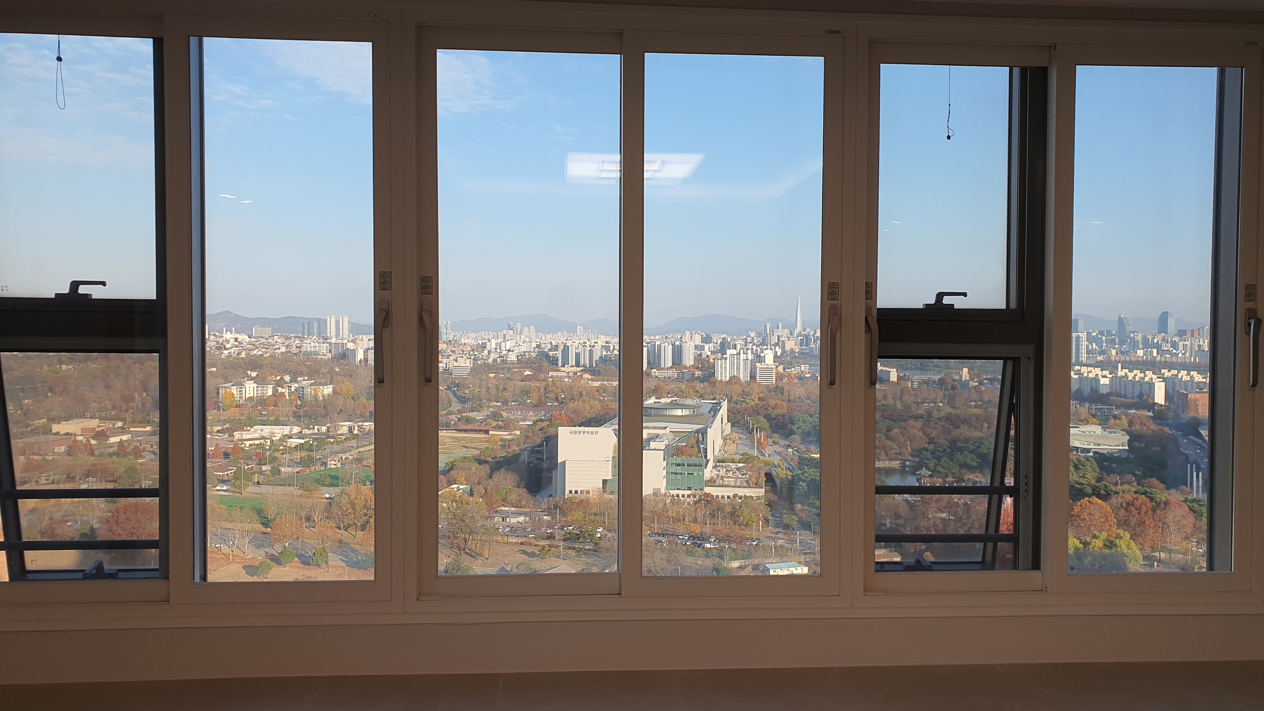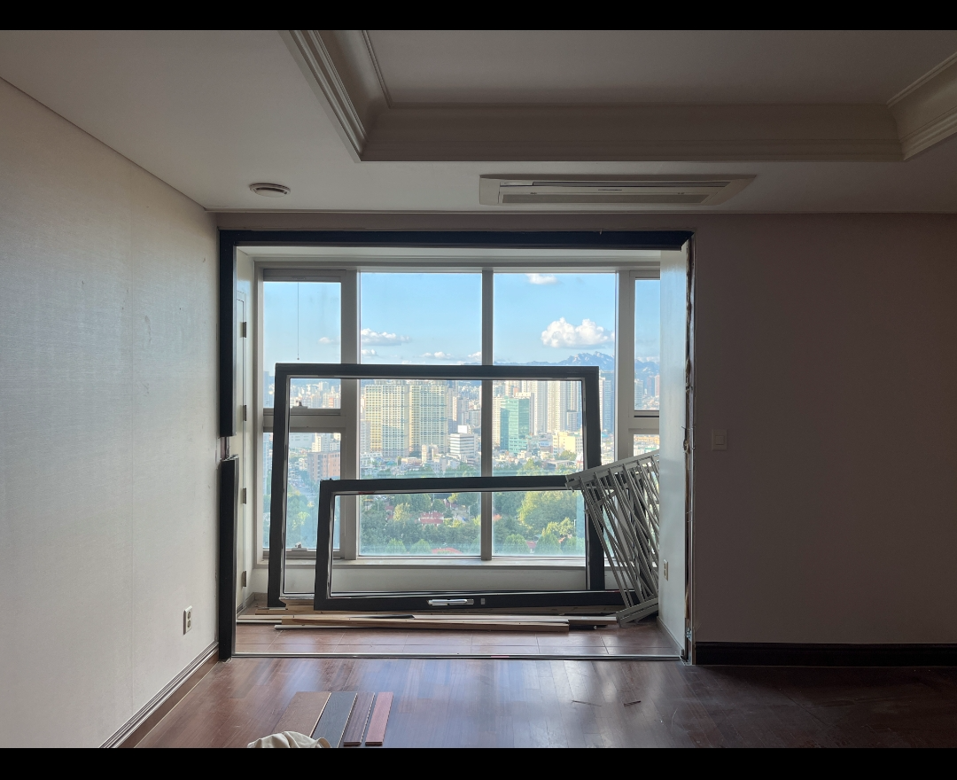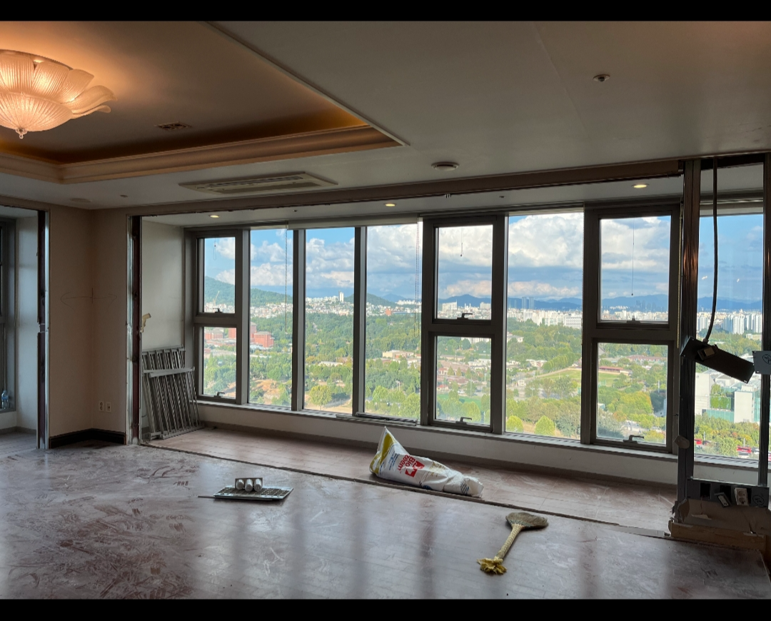 인테리어를 구상하면서 가장 먼저 꼭 해야한다고 생각했던 부분은 거실 확장공사였다. 파크타워 북동향 라인의 가장 큰 매력은 확트인 용산공원 및 남산타워 뷰이다. 이 장점을 최대한 살리고자 거실창의 개방감을 극대화시킬 수 있도록 창을 가리는 모든 가벽을 철거했다