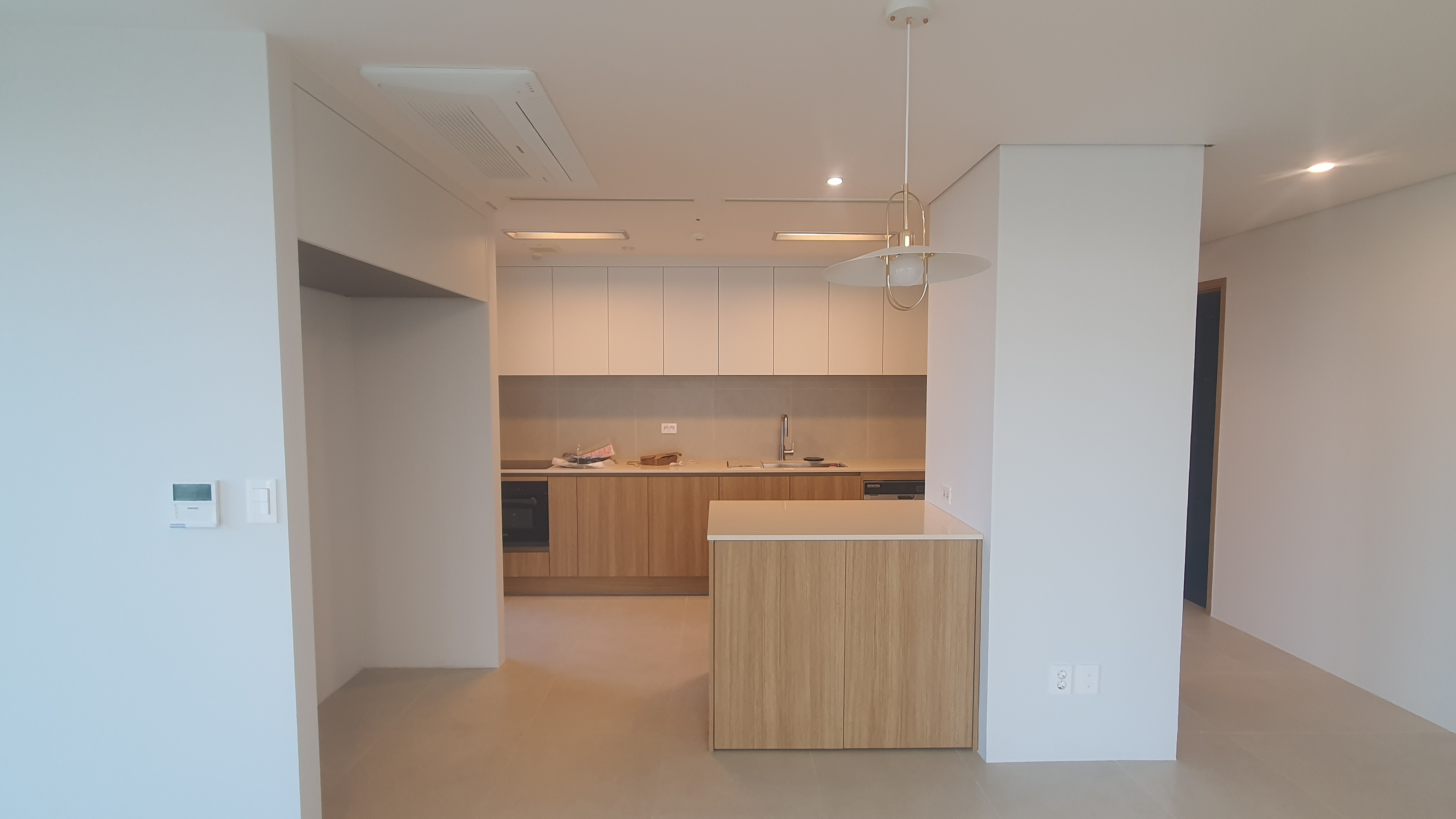 초기에는 복도에서 부엌으로 들어가는 중문을 막고 벽을 설치해 'ㄱ'자 형태로 부엌을 바꾸고 아일랜드 식탁을 치우려고 했었다. 벽으로만 막으면 복도에 채광문제가 있을 것 같아 가운데에는 유리벽을 넣어뒀다. 그러나 공사를 진행하는 과정에서 마음이 바껴서 기존 형태를 그대로 살리는 방향으로 선회했다. 안그래도 복도가 길기 때문에 전체를 다 벽으로 뒀으면 조금 답답한 느낌이 들었을 것 같다.