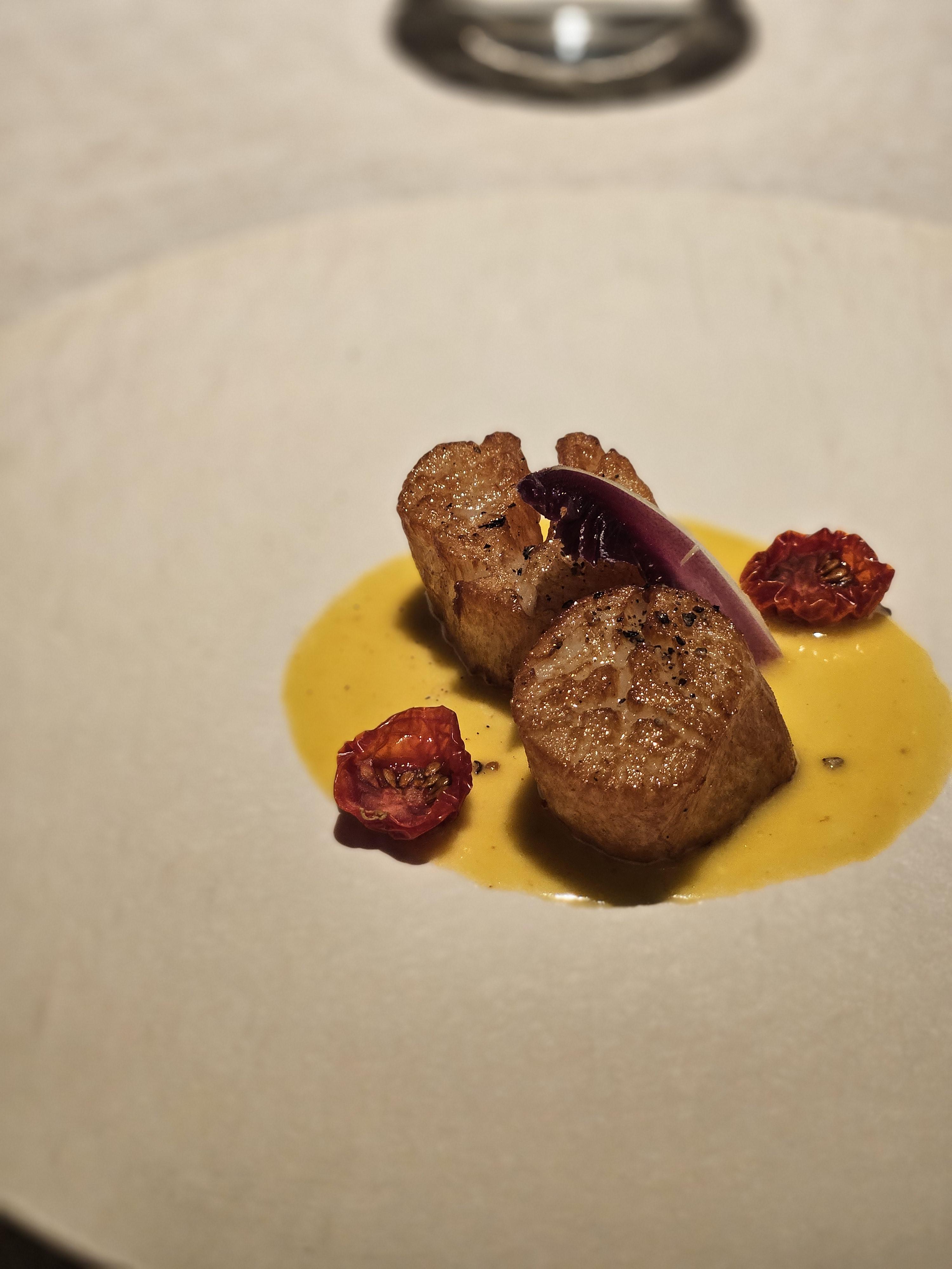 샐러드는 그냥 아주 평범했습니다. 야채 없이 너무 고기만 섭취하면 소화 불량이 생길 수 있으므로, 영양사가 영양 밸런스를 맞춰준듯 필요한 야채들을 무리 없이 섭취할 수 있도록 보조된 맛이였습니다. 관자 구이도 모난데 없이 평범한 맛이였구요. 접시가 취향에 맞아서 플레이팅 모양새가 예뻐보였습니다.