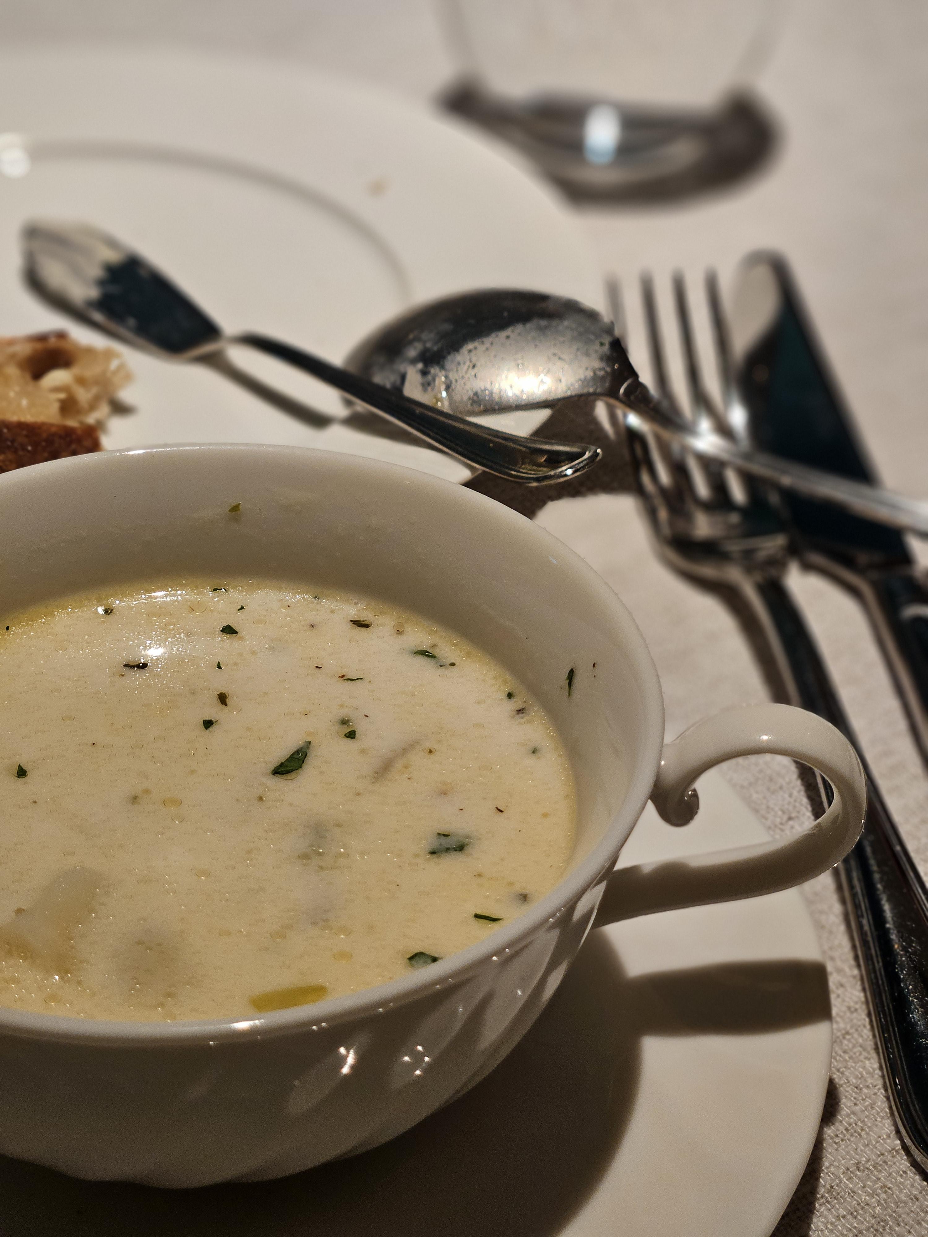 식전빵은 다소 딱딱한 식감으로 겉바속촉의 식전빵을 선호하는 제게는 조금 아쉬운 느낌이였지만, 씹을 수록 고소한 맛이 있어서 나쁘지는 않았습니다. 크램 스프는 내용물이 많이 들어 있었고 크리미 걸쭉한 식감이 아니라 국물처럼 호로록 먹을 수 있는 스프였습니다. 전 스프를 워낙 좋아해서 아주 맛있게 먹었습니다.