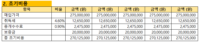 - 총 초기비용: 매입가격 - 취득세 - 중개수수료 - 보증금