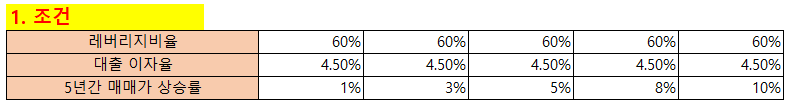 레버리지 비율은 말 그대로 대출을 얼마 만큼 받을 것인지 비율을 설정한 것입니다. 사람마다, 자산마다, 금융권마다 대출을 받을 수 있는 비율 정도가 다를텐데요. 저의 경우 대략적으로 60% 정도로 잡아두었습니다. 금리 조건에 따라 레버리지 비율을 어떻게 세팅해두느냐가 최종적인 자기자본수익률에도 많은 영향을 미치게 됩니다. 시뮬레이션 단계에서는 조금 보수적인 수치로 접근해보았습니다.