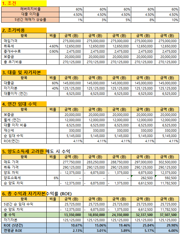 - 5년간 매매가 상승률: 추후 자산 매각 시 양도차익을 포함한 수익률 계산을 위한 조건