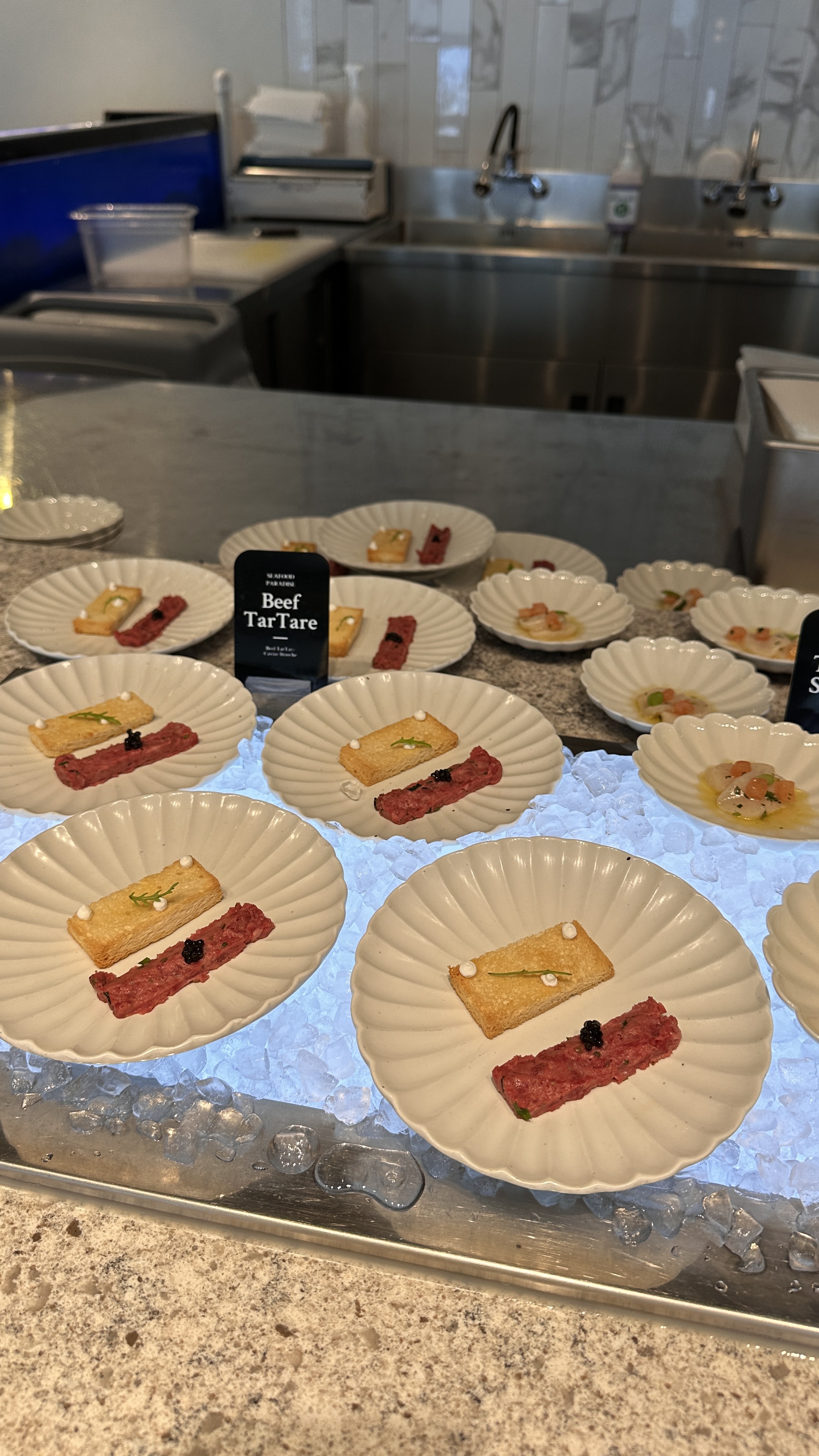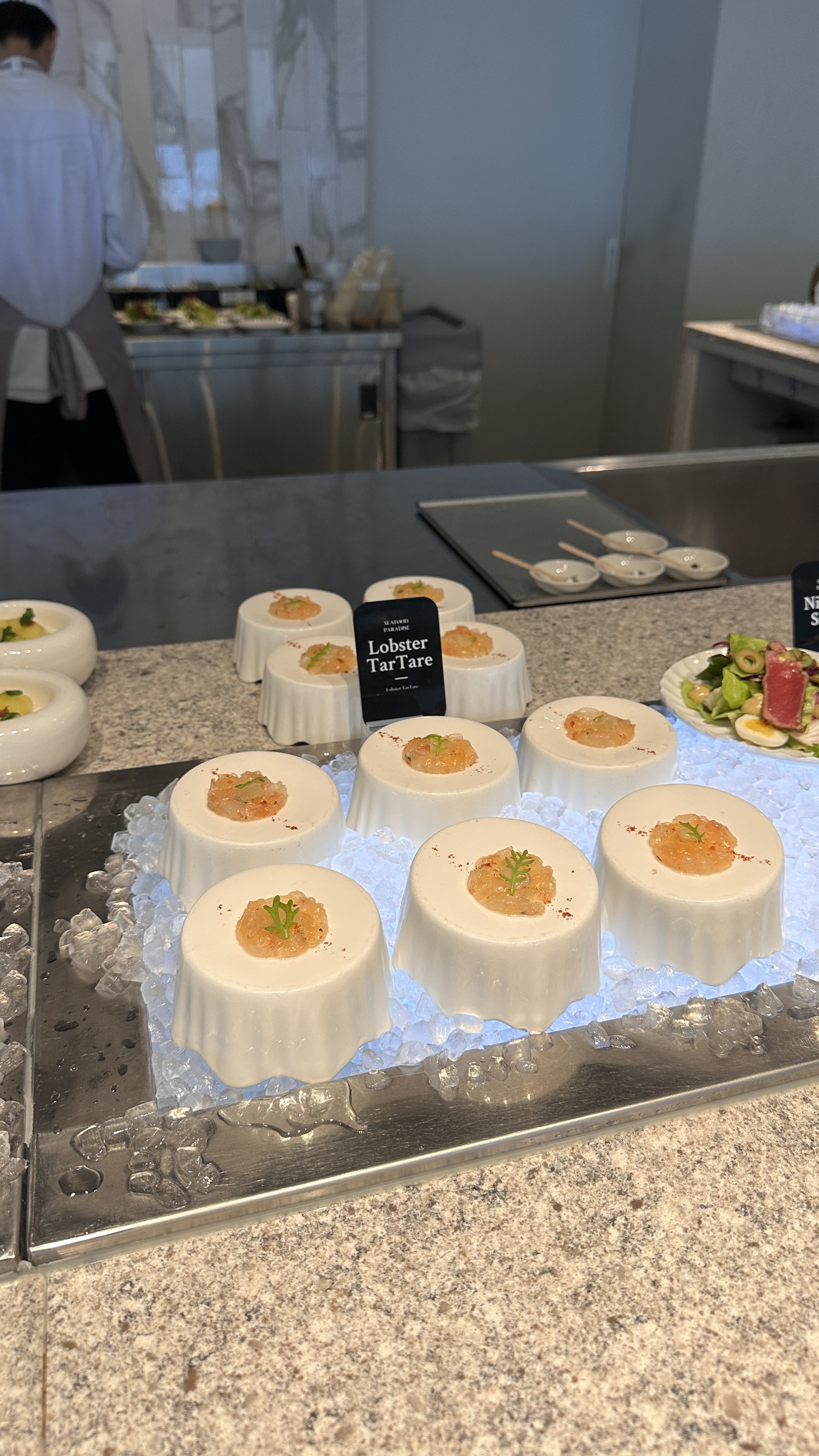 샐러드부터 타르타르, 캐비어, 연어구이, 새우찜, 조개찜, 게살스프, 전복죽 등 소소하게 전체요리 삼아 먹을 음식들이 준비되어 있었습니다. 가끔 호텔 결혼식 가면 전체요리로 나오는 음식류들이 모여 있다고 생각하시면 되겠습니다. 맛도 거의 그 정도 수준이였던 것 같습니다.