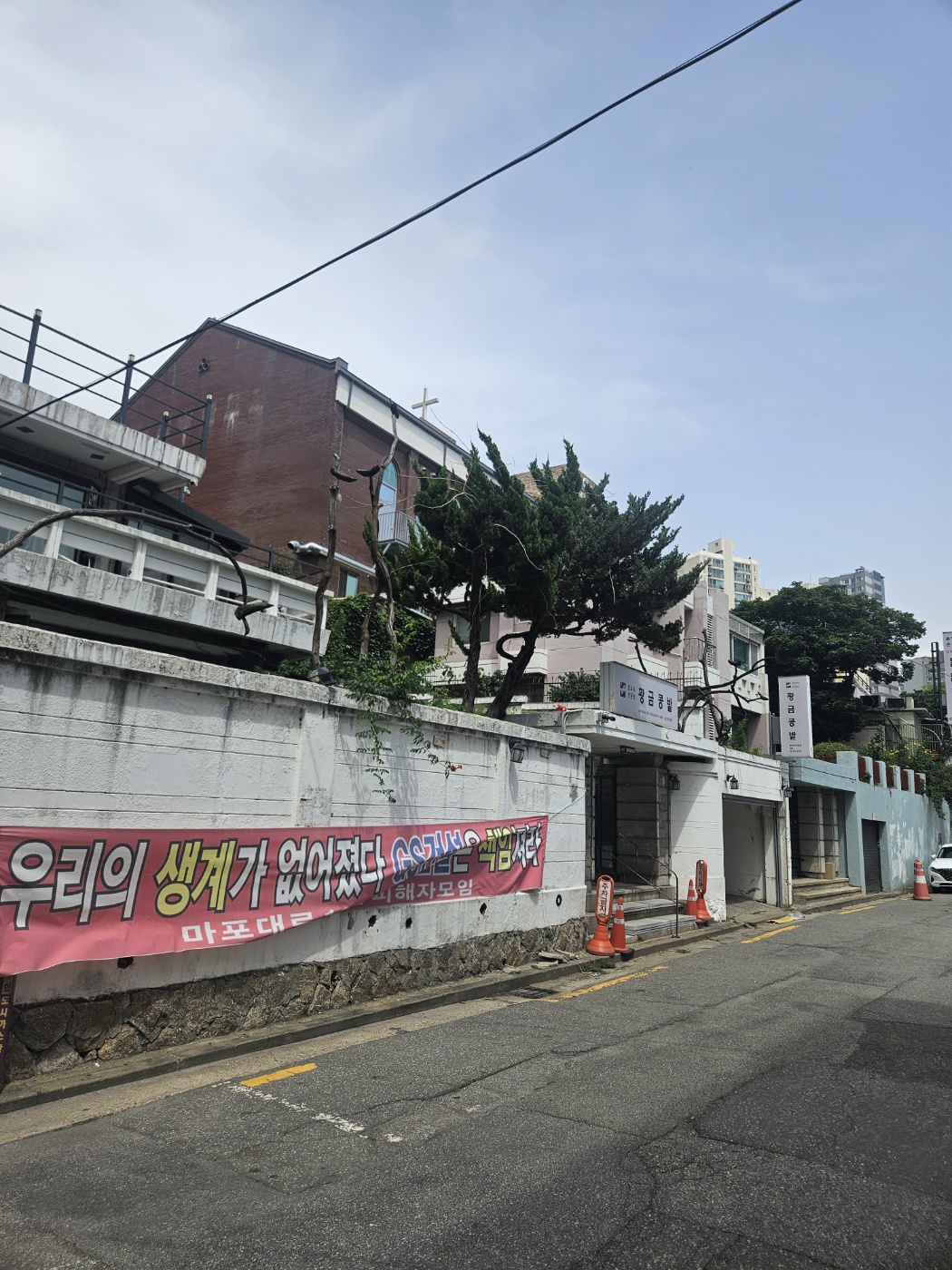 4번 구역 중 라첼스 단지 안쪽으로 들어가는 도로변에는 재개발로 인한 피해를 호소하는 현수막이 걸린 빌라지역이 나옵니다. 상업 활동을 하는 지역 주민들의 민원제기로 보이네요. 서울서부지방검찰청 방향으로 긴 길목을 따라 걸어가는 구역은 현재 도로변이 좁고 차량 주차구역이 있어 통행하기가 어렵습니다. 그러나 개발이 완료된 이후에는 도로도 넓어지고 정비가 되면서 환경이 좋아지겠죠. 지금은 좁고 낙후되어 보이지만, 재개발이 완료되고 난 이후의 상상력이 필요한 부분입니다.