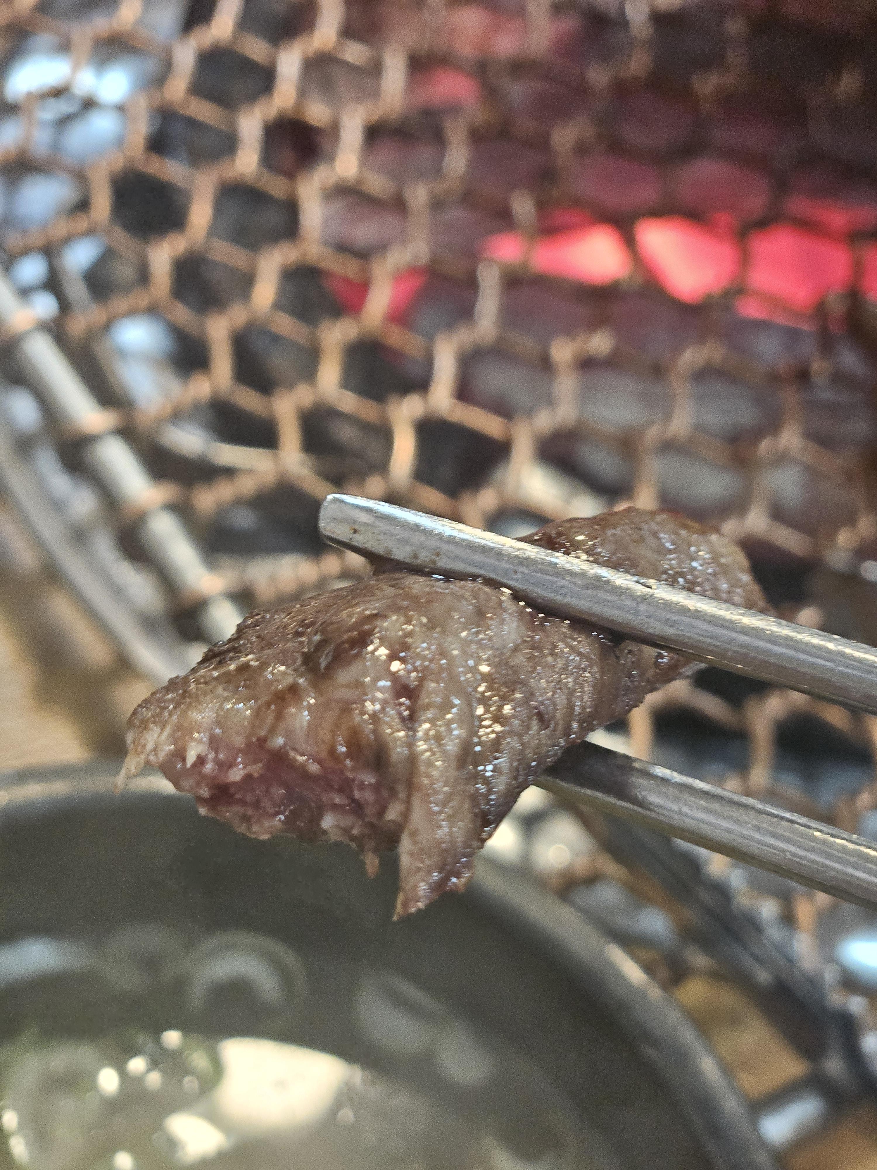 사실 소고기를 숯불에 굽는데 맛이 없다는건 뭔가 잘못되어도 크게 잘못된 일입니다. 그것도 한우라면 말이 안되는 일이죠. 금자네생등심의 한우 생등심은 우리가 기대할 수 있는 맛있는 소고기의 맛을 내줍니다. 등심이지만 부드럽고 한우답게 고소한 맛이 좋습니다. 숯불 화력도 쌔서 금방 금방 익으니 아주 술술 입으로 잘 들어갑니다. 기본 찬으로 무절임과 소고기무국도 나옵니다. 소고기와 함께 먹기 괜찮은 조합이였습니다.