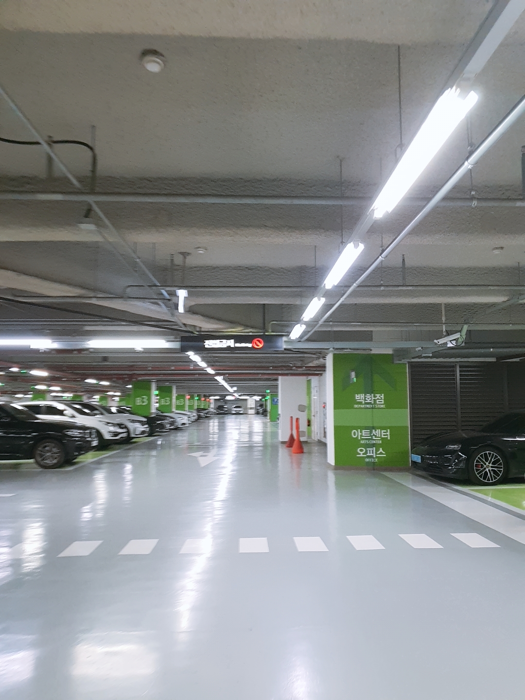아파트 지하 3층에서 현백으로 이어진 출입구를 지나면 바로 현대백화점 지하주차장이 나옵니다. 아파트 지하3층과 현백 지하 3층이 연결되어 있는 구조인데요. 이 아파트 출입구는 아파트 출입카드를 찍어서 열거나, 휴대폰 아파트 어플을 깔아두면 블루투스로 자동으로 열리는 시스템입니다. 출입구를 나오면 바로 왼편에 에스컬레이터가 보이고 이걸 타고 한 층 올라가면 현백 지하2층 식품 매장이 나옵니다. 편의성 최고👍