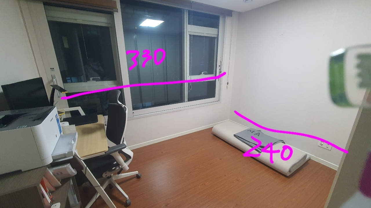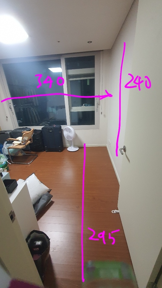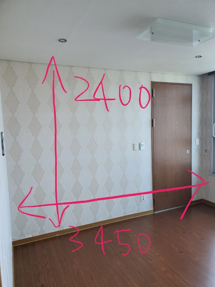 사실 평면도로 봐도 잘 안 보일 수 있기 때문에, 실제로 직접 측정한 사이즈 사진도 덧붙이겠습니다.😂 디큐브시티 아파트의 층고는 240cm 로 일반 아파트보다 층고가 좀 더 높다보니 도배나 필름 비용도 조금 더 들었습니다.