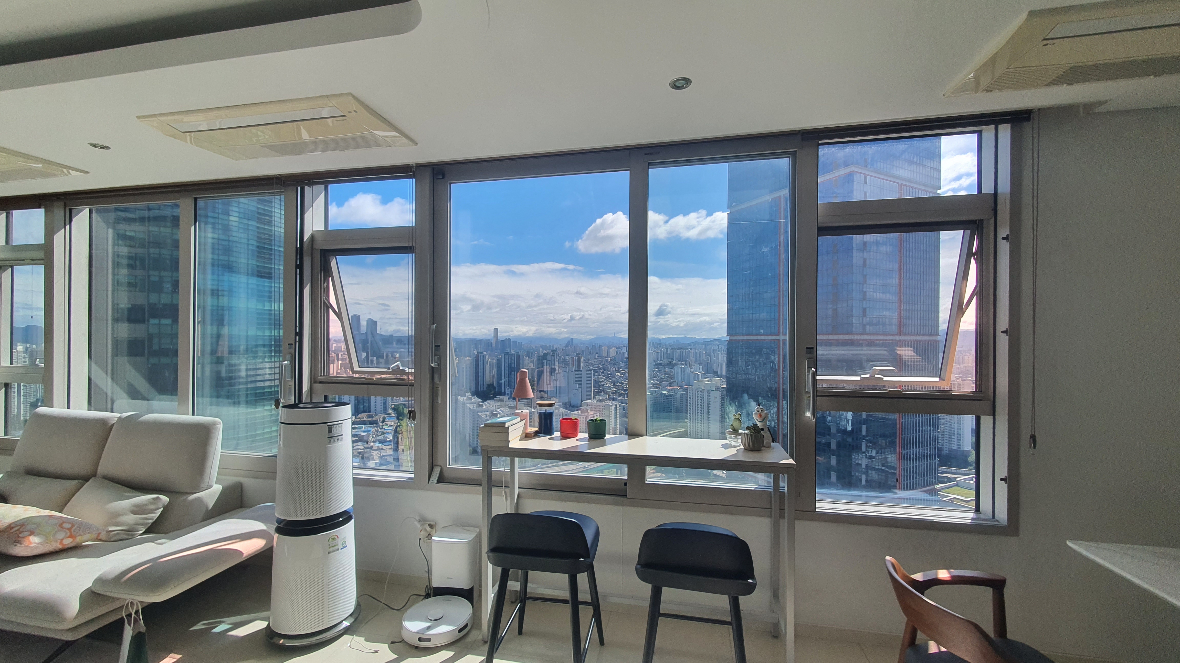 디큐브시티 45평의 경우, 거실이 매우 크게 빠져있는 구조입니다. 직사각형 형태로 길게 빠져 있는 구조이다 보니, 실제 크기보다 약간 작게 느껴지는 측면이 있는데, 가구를 배치해보면 상당히 큰 거실 공간임을 알 수 있습니다.